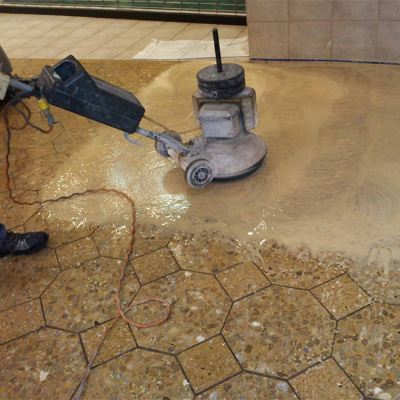 We pre-treat stains with specialized cleaners safe for travertine, ensuring they are effectively removed without damaging the stone before polishing.